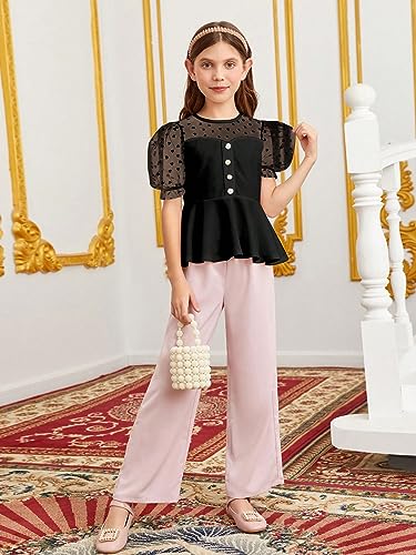 • Features: decorative buttons front, contrast mesh, sheer short sleeve, puff sleeve, peplum top, girls blouse