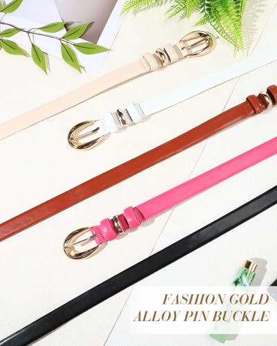 Women Belt Bulk: you will receive 5 pack women belt with gold buckle in different colors: black, brown, white, pink and beige; These skinny black belt are made of quality PU and come with gold buckles, suitable for both casual and formal occasionsQuality and Durable: this women leather belts for jeans is made of quality PU leather, with smooth and durable edges, soft and comfortable feel, clear texture, exquisite workmanship and durable; The women's dress belt adopts a solid pin buckle, and the classic retro style will never go out of styleDifferent Sizes to Fit: ladies fashion belts for jeans comes in 2 sizes (Length 39.4/100cm, fits waist 27 - 31; Length 43.3/110cm, fits waist 32 - 36) Belt width: 2.3cm/0.9; Fits most women; Please measure your waist before purchasing to ensure the belt fitsGold Buckle Decoration: the black belts for women is equipped with a trendy gold buckle, the alloy buckle is shiny and classic, adding a touch of sophistication and modernity to your look; These cute belts for women stand out with their charm, creating a chic and fashionable beautyWidely Applied: this classy belts for women is not only fashionable, but also practical; Whether paired with jeans, skirts, dresses or trousers, it can add layers and taste to the dress code; Multi-color belts are also great gift choices for girlfriends, lovers, friends and family Perfect for everyday use. supreme materials and excellent craftsmanship ensure long-lasting durability.
