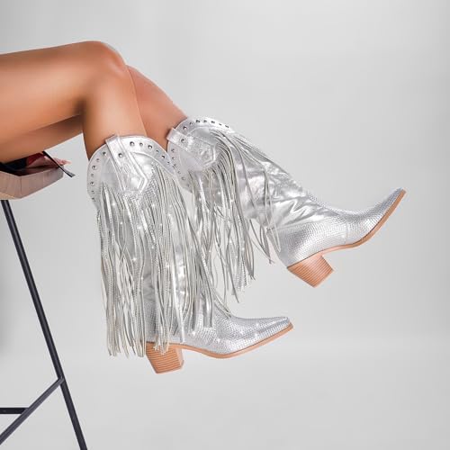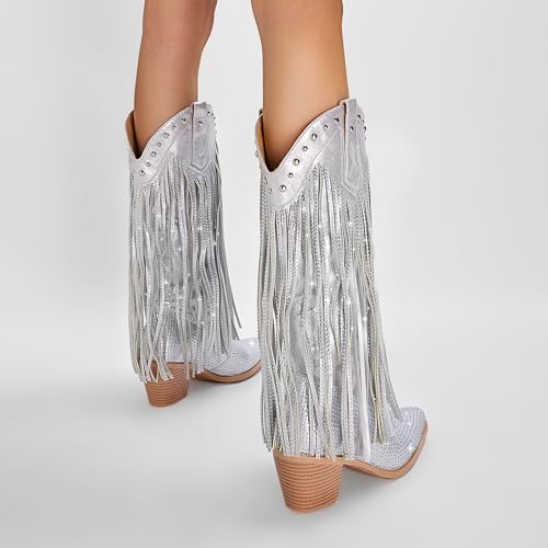 AIJIVOU Women's Rhinestone Fringe Cowgirl Boots, Sparkly Western Cowboy Boots Pointed Toe Knee Block Chunky Middle Heel Pull On Mid Calf Boots for Women Girl Party