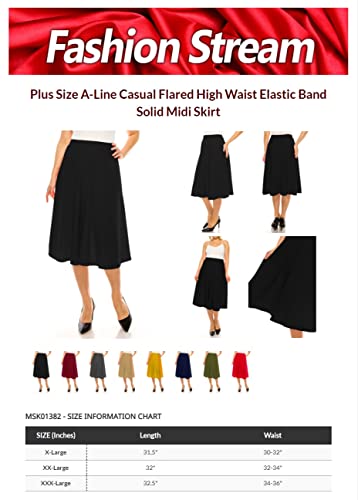 popular ! FashionStream Women's Plus Size A-Line Casual Flared High Waist Elastic Band Solid Midi Skirt