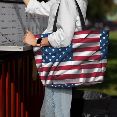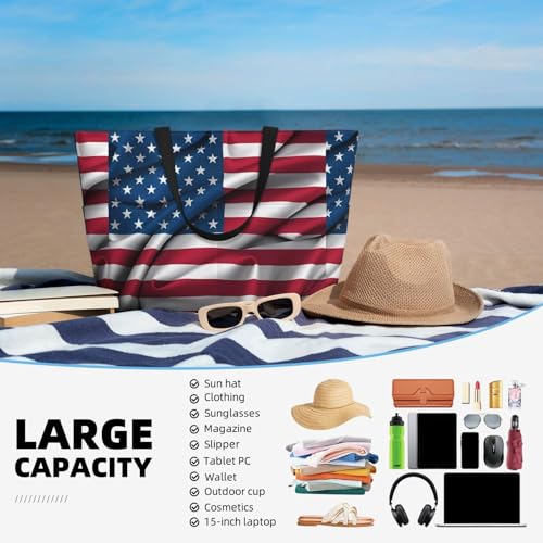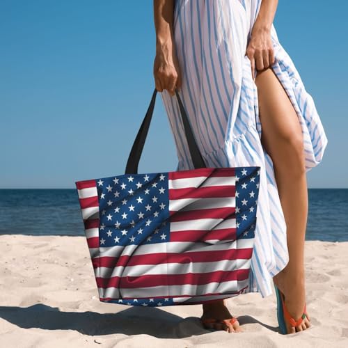 American Flag Print 28L Large Beach Tote Bag, 7 Pockets Waterproof Travel Shoulder Bag, Gym Oversized Tote