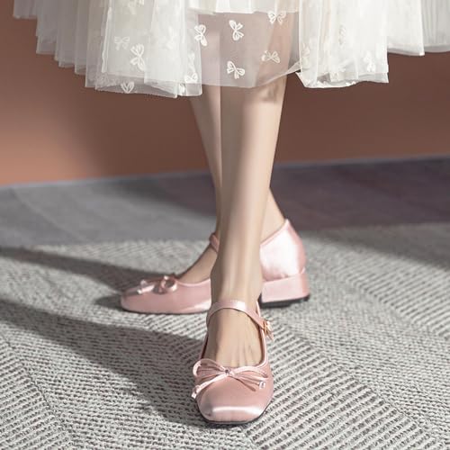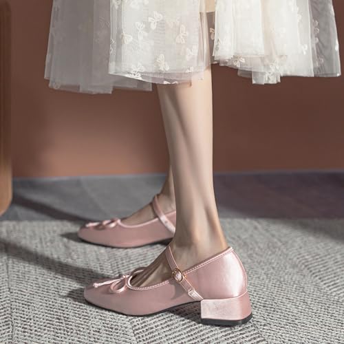 Zeberfi Women's Satin Bow Tie Low Chunky Heel Mary Jane Pumps Fashion Square Toe Shallow Mouth Adjustable Buckle Strap Low Block Heels Business Wedding Ballet Dress Shoes