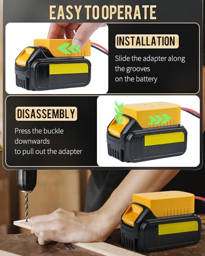 Brand: VibitInput Voltage: 20 VoltsOutput Voltage: 12 VoltsPlug Format: Type ATotal Power Outlets: 1For Dewalt Batteries: Compatible with Dewalt sliding-style batteries, such as Model DCB203, DCB204 DCB205, DCB206, DCB606, DCB609, etc.Step-down Converter: Input voltage: DC 20 V; Output: DC 12 V/15 A; Power: 180 W; Efficiency: ≥ 95%. Ideal for powering golf carts, power wheels, DIY toys, RC cars/trucks, LED lights, cameras, etc.Real-time Protection: The voltage inverter shuts off automatically if there’s overvoltage, overload, under-voltage, overcurrent, overheating or short circuit. Stop excessive transient current timely to avoid damage to the battery and the equipment.robust Power Adapter: It’s equipped with 12 AWG wires. Dependable to endure heat up to 105 °C and voltage up to 600 V. And the thickened metal sheet is rustproof, always conducting electricity fast and smoothly. You can freely turn on/off the battery through the switch as needed.Heavy Duty: The aluminum alloy converter is totally waterproof, shockproof and fast in heat dissipation. And the sturdy ABS adapter is reusable and resistant to wear, impact or breaking. Perfect for everyday use. supreme materials and excellent craftsmanship ensure long-lasting durability.