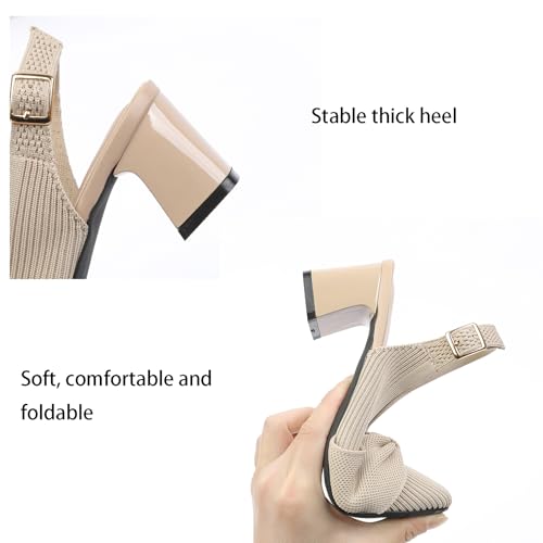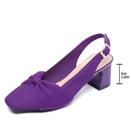 Women'S Knitted Bowknot Chunky Heel Slingback Pumps With Adjust Ankle Strap Fashionable Square Toe Anti-Slipper Heel Mule Sandals For Party, Date