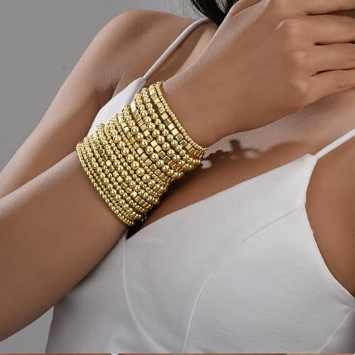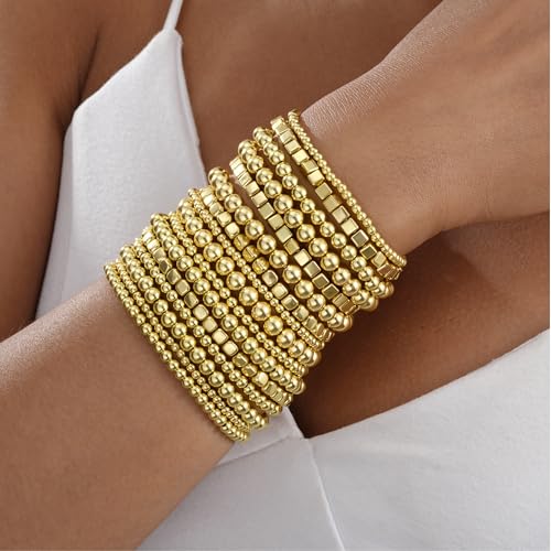 ÌF ME 16 PCS Gold Bead Bracelet for Women, Gold Beaded Stretch Plated Stackable Strand Bead Ball Bracelets stack Adjustable Jewelry Set for Gifts
