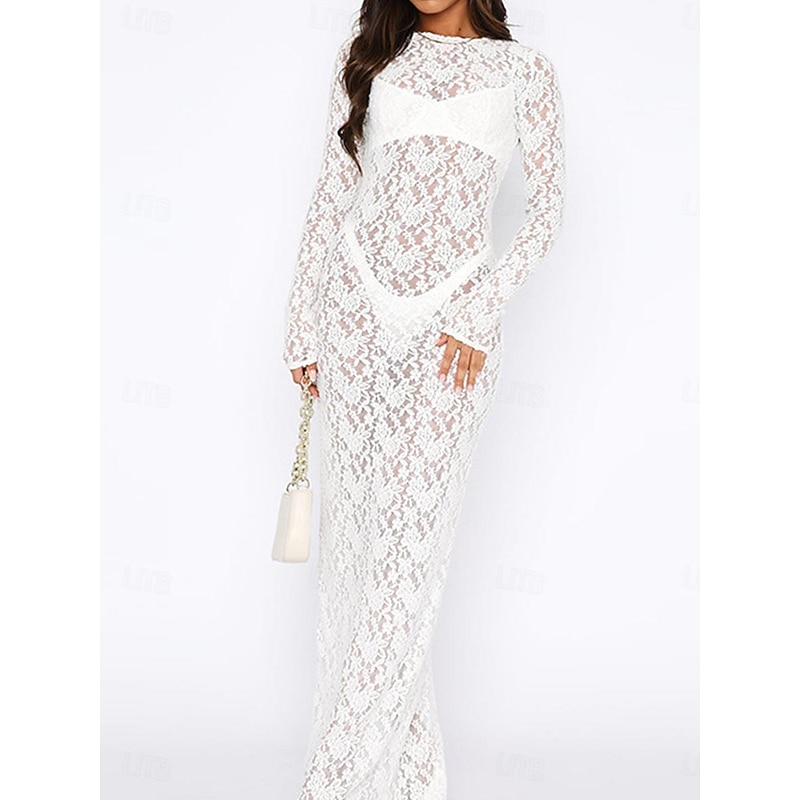 Women's Long Dress Maxi Dress White Dress Black Dress Lace Dress Casual Dress Streetwear Maxi Sexy Vacation Street Holiday Slim Long Sleeve Round Neck Black White Summer