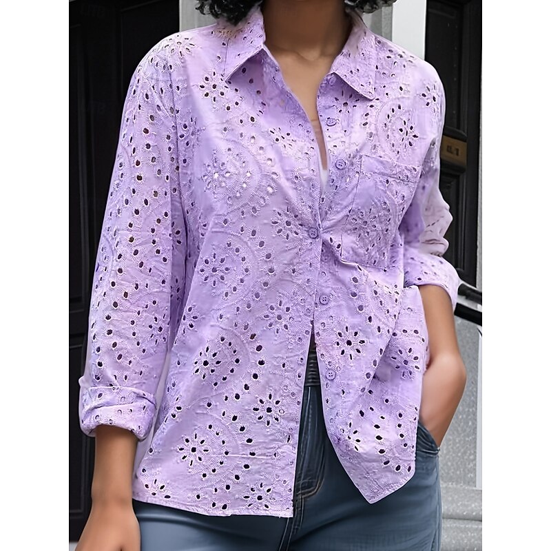 More information about Women's White Elegant Lace Tops Eyelet Blouse Floral Regular Tops Long Sleeve Shirt Collar Buttons Eyelet Regular Fit Daily Romantic Petite Tops Summer Holiday Wear White Purple