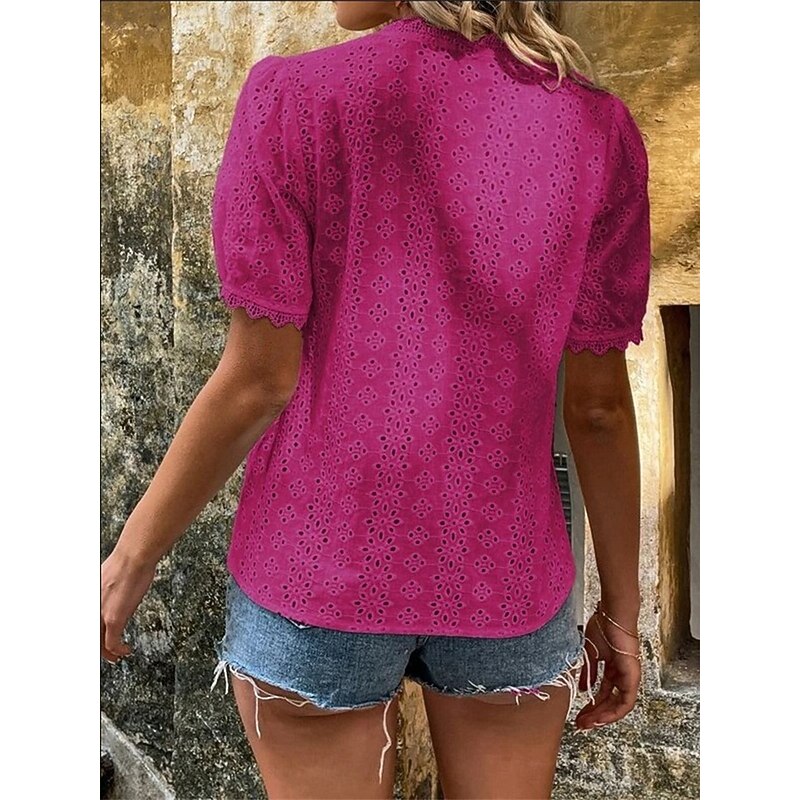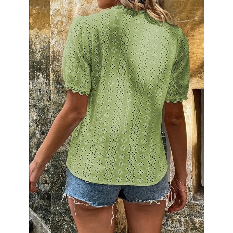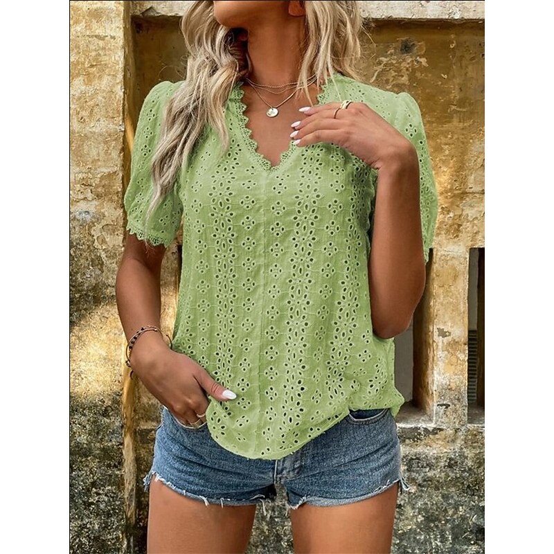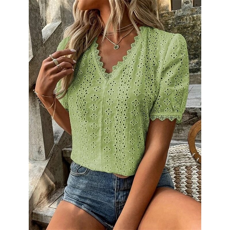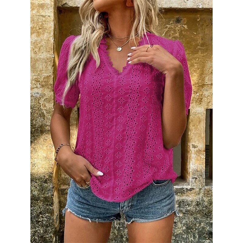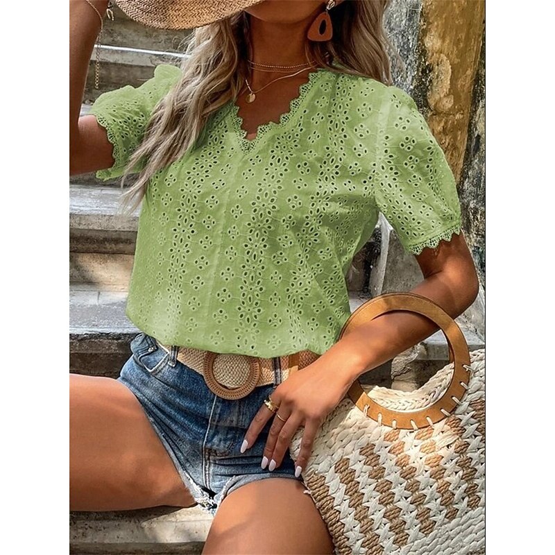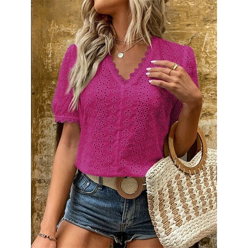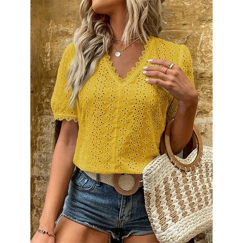 This Women's Shirt Blouse Solid Color Elegant Daily fashionable Short Sleeve V Neck Regular Tops Work Daily Holiday Lace Hollow Out White Yellow Green Rose Pink Summer Spring combines elegant design with practical functionality. Every detail has been carefully considered to ensure you get the best possible experience. The finest construction means this product will serve you well for years to come.