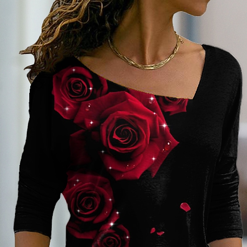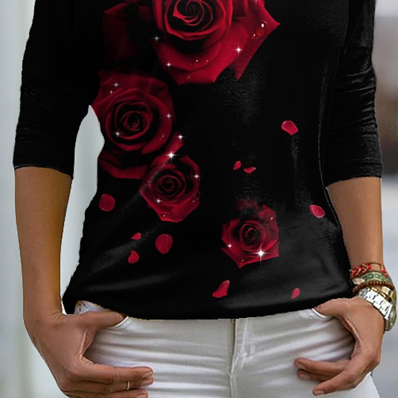 Highlights [Fabric] : Crafted from a high-quality polyester blend, this women's plus-size T-shirt offers a micro-elastic fit, ensuring both comfort and a flattering silhouette suitable for any body shape. Its soft and stretchy material allows for ease of movement and long-lasting wear throughout the fall and winter seasons. [Fit & Style] : Featuring a regular fit, this T-shirt is designed with a classic V-neckline and long sleeves, providing an elegant and versatile look. The wide scoop neck adds a modern touch, making it perfect for both casual and semi-formal settings. [Design Highlights] : The standout design of vibrant rose prints set against a chic black backdrop creates a bold, eye-catching look. The sparkly and glittery graphic patterns add a touch of glamour to this timeless piece, ensuring it remains a standout item in your wardrobe. [Occasions] : Ideal for holiday gatherings, daily outings, casual weekends, and Valentine's Day celebrations, this T-shirt effortlessly transitions between various events. Its blend of floral themes with a hint of sparkle offers charm and sophistication suitable for any occasion. [Size Range] : Available in a wide range of sizes from S to 5XL, this T-shirt accommodates different body types, providing a comfortable and trendy fit for everyone. Perfect for everyday use. supreme materials and excellent craftsmanship ensure long-lasting durability.