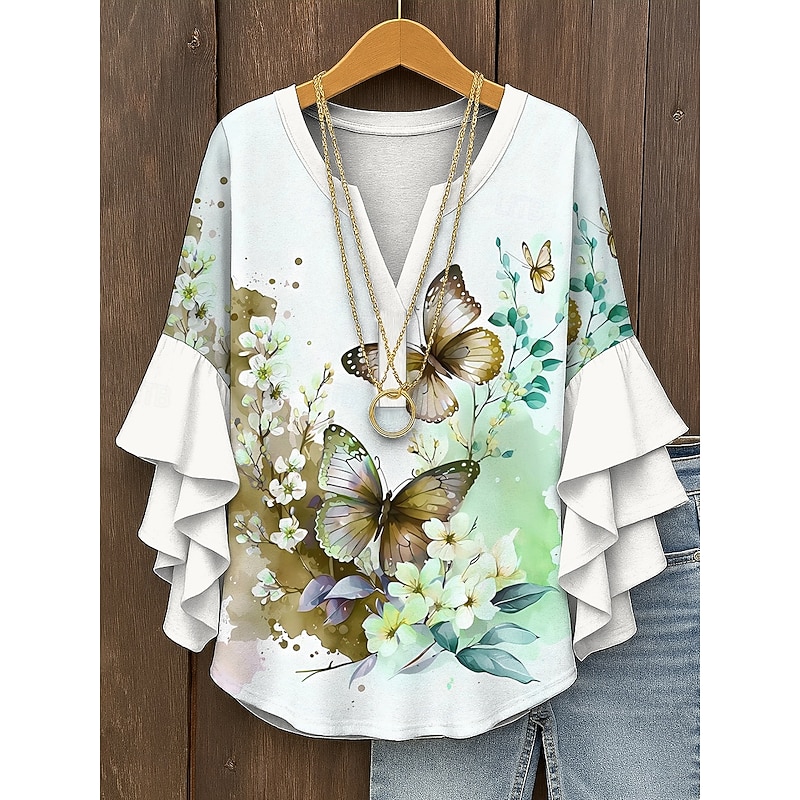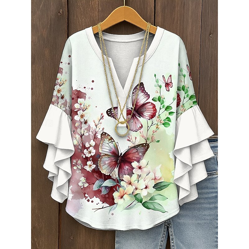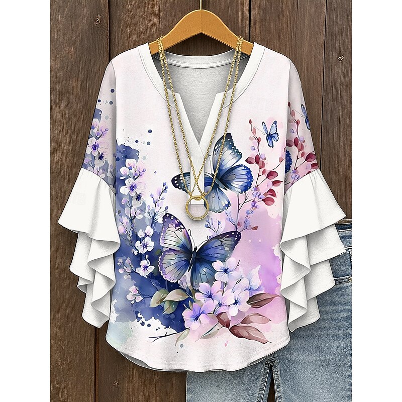 popular ! Women's Blouse V Neck Layered Ruffle Sleeve Tops Floral Graphic Butterfly Bohemia Vintage Tropical 3/4 Length Sleeve Regular Tops Daily Holiday Vacation Wear Print Yellow Red Blue Purple Green Summer