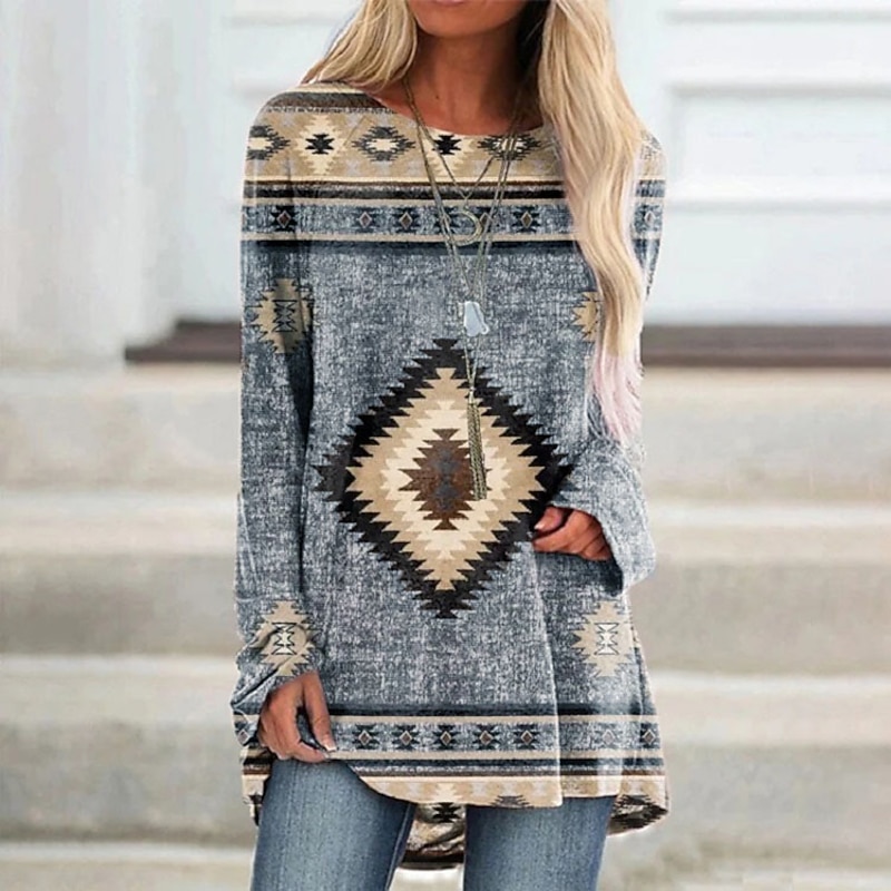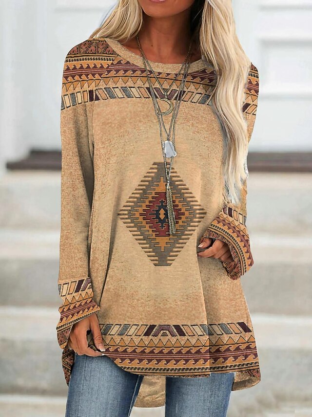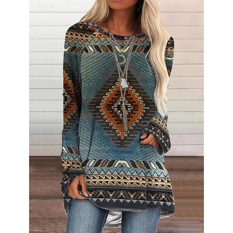 Highlights - Stay fashionable and comfortable with this long sleeve tunic for women - Embrace a vintage, ethnic, and boho style with this exclusive piece - Stand out in geometric or plaid patterns with a trendy print design - Flattering round neckline perfect for any occasion - Available in plus sizes for a perfect fit