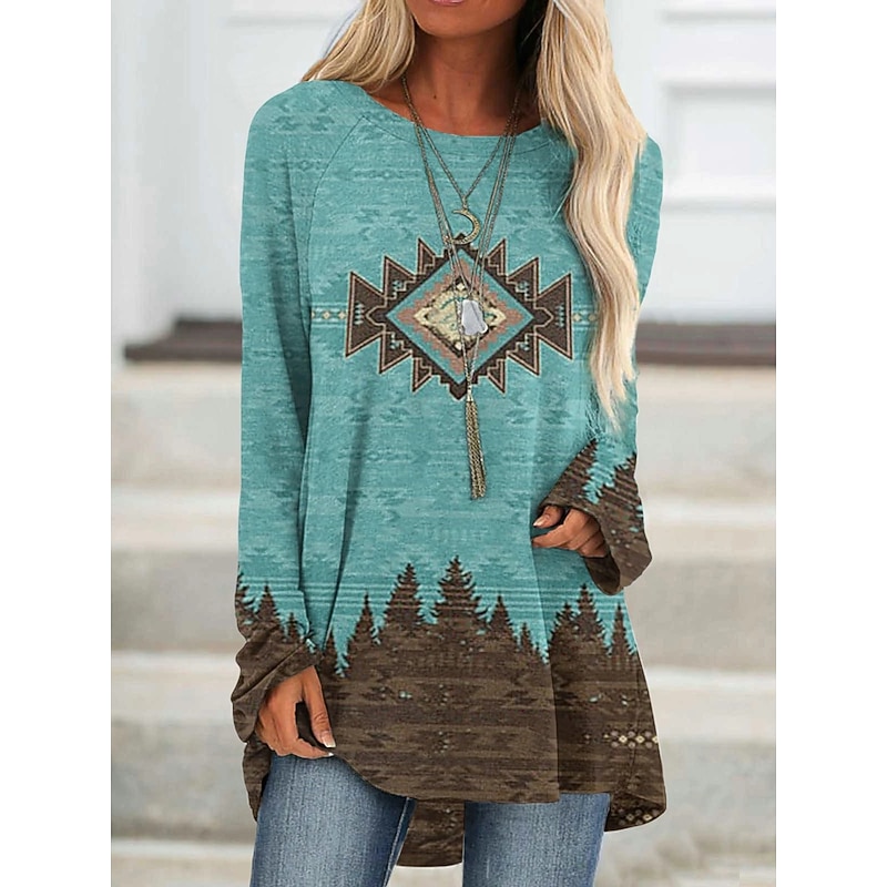 popular ! Women's Plus Size T Shirt Tunic Shirts Geometric Plaid Vintage Tunic Ethnic Long Sleeve Round Neck Long Tops Casual Print Marron Yellow Light Green Wine Red Fall & Winter Prefall