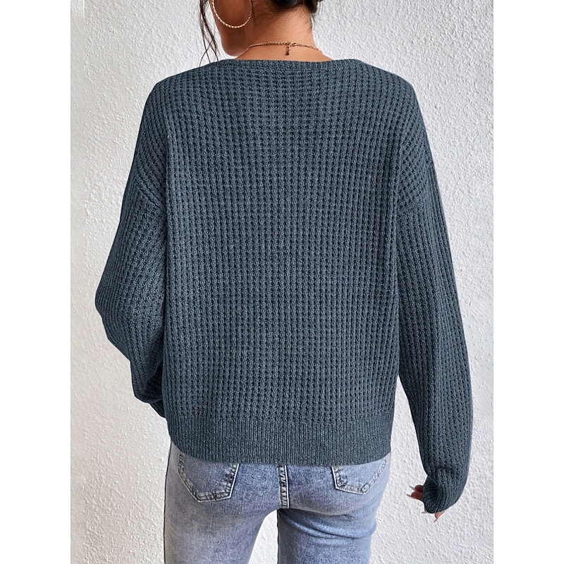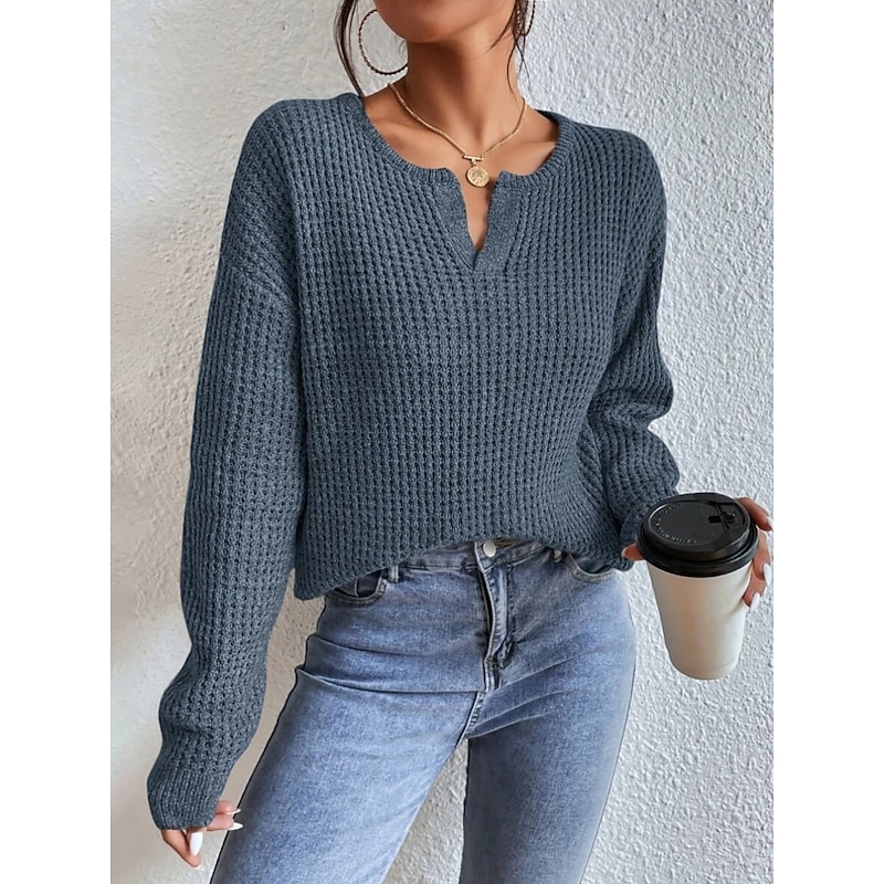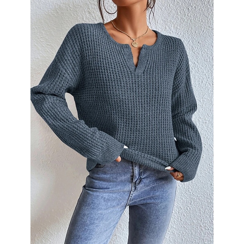 Highlights [Fabric] Crafted from a blend of soft and breathable cotton and acrylic, this women's sweater provides a comfortable and warm knit texture, perfect for the fall and winter seasons. The knit fabric features a distinctive textured waffle pattern, bringing a up-to-date and fashionable element to the design. [Fit] With a relaxed fit and long sleeves, this sweater is ideal for layering during those cooler days. The regular fit ensures it drapes elegantly and comfortably over the body, making it a versatile addition to your wardrobe. [Design Highlights] Featuring a classic polo collar and a subtle V-shaped neckline, this sweater adds a touch of femininity and sophistication. The textured knit pattern enhances its visual appeal, while the solid color options of navy blue and gray allow for easy pairing with various accessories. [Occasions] Perfect for weekend outings, daily errands, and work settings, this sweater suits a variety of occasions. Its basic and versatile style makes it a staple piece for casual or professional environments, providing both charm and practicality. [Size Range] Available in sizes S, M, and L, this sweater accommodates different body types and preferences, offering a suitable fit for a wide range of customers.