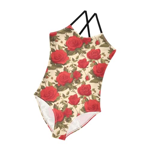 KLL Floral Pattern Red Roses Girls 1 Piece Bathing Suit Summer Swimwear Adjustable Strap speedy-Dry