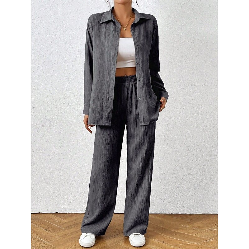 More information about Women's Fashion Streetwear Pants Sets Long Sleeve Shirt Collar Solid Color Daily Wear Date Black Beige Gray Spring Regular Fit