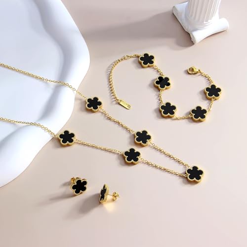 Material: Stainless SteelMetal type: Stainless SteelGem type: No GemstoneThe five-leaf clover is also know as the flower of happiness. Its flower language and symbolism representhappiness, good luck and a bright future. The fiveleaves of the five-leaf clover each have their oummeaning,representing the promise of wealth,love,health, good luck and spiritual connection.Wear itdaily and it will always bring you good luck.Versatile Set:This clover jewelry set features adelicate clover motif with White Black Green and 18K gold plated accents for a timeless, stylishlook,Includes a necklace with adjustable extensionchain, a bracelet,and matching stud earrings for acomplete ensemble.Comfortable to wear for all.PERFECT GIFT:Packed to make Great,ainty lucky cloverEarrings, Necklace &Bracelet are the best gifts forwives,girlfriends,mothers and daughters onThanksgiving,lother's Day,Christmas,birthdays,Valentine's Day and other holidays.EXOUISITE TECHNOLOGY:The Earrings,Necklace &Bracelet is made of high quality hvpoallergenicstainless steel material, strong, does not fade, Ourewelry is Anti Allergic, Nickel Free, Lead Free whichmakes ourewelry ldeal for Sensitive Skin.SHOP WITH CONFIDENCE:30 days money-back.Our customers are our highest priority. If you have any questions or requests, don't hesitate to contact us. Perfect for everyday use. High quality materials and excellent craftsmanship ensure long-lasting durability.