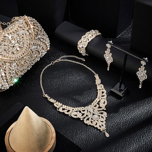 More information about Quelay 4 Pcs Women Rhinestone Clutch Purses Jewelry Set Silver Clutch Evening Bag Bling Crystal Necklace Dangle Earrings Sparkly Bracelet for Wedding Formal
