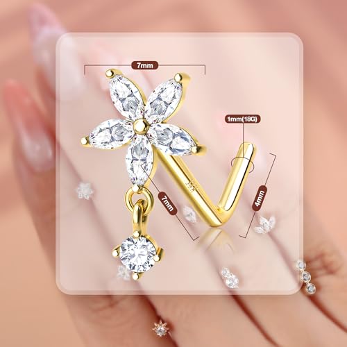 14K Real Gold Nose Stud - 18G Nose Stud L Shaped Nose Rings Dangle Nose Rings for Women CZ Opal Flower Sun Nose Piercings Gold Nose Jewelry for Women Men