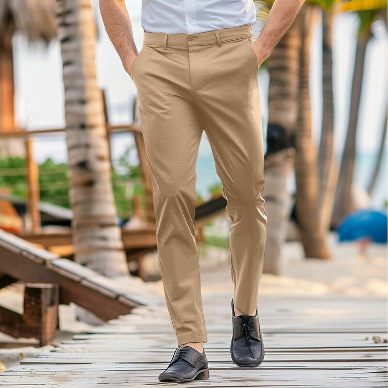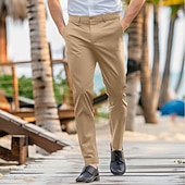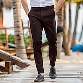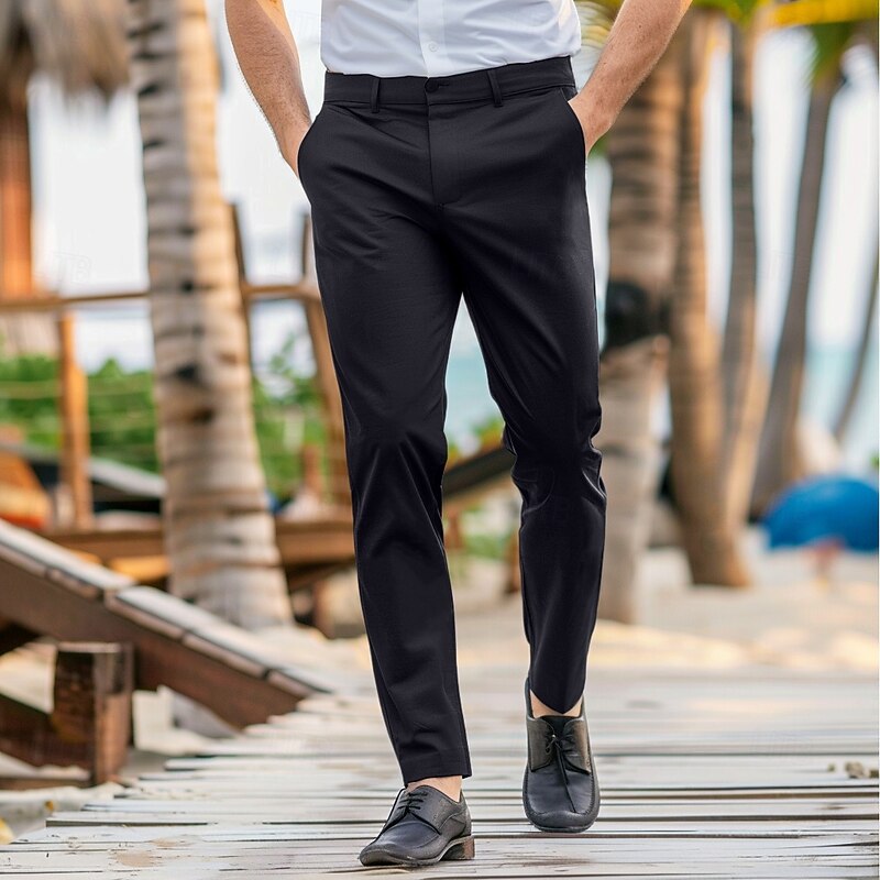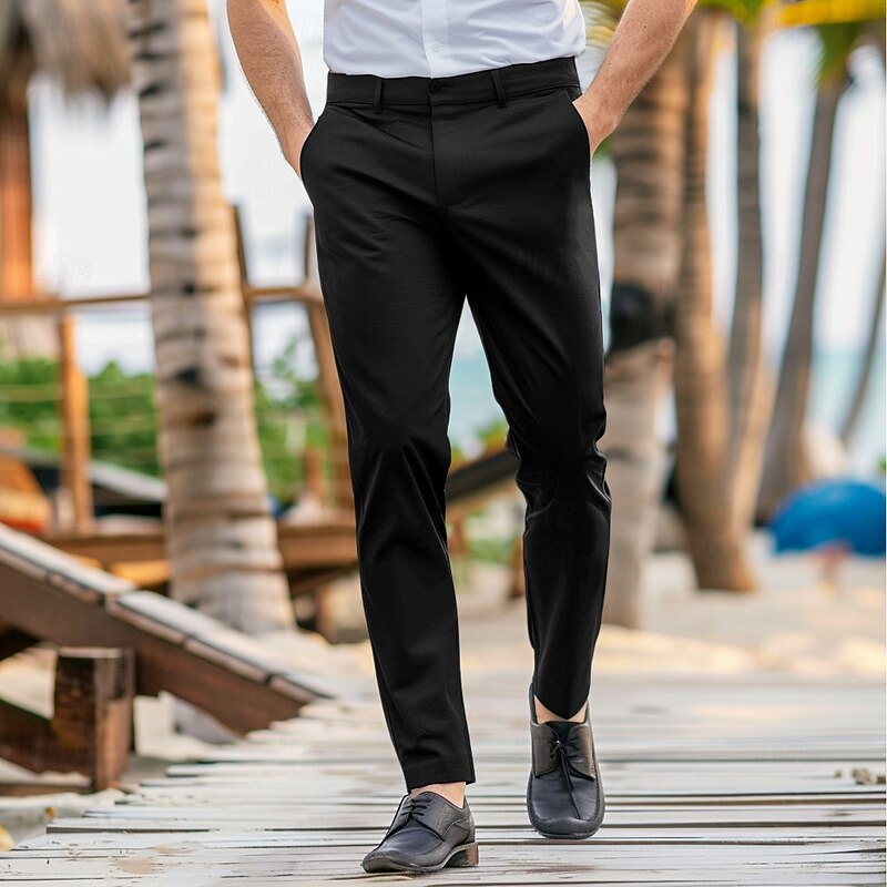 Highlights [Fabric] : Crafted from a high-quality chemical fiber blend, these men's dress pants offer a comfortable, breathable feel with micro-elasticity for ease of movement. The fabric is designed to provide durability without compromising on style. [Fit] : Featuring a regular fit, these trousers strike the perfect balance between a tailored and relaxed look. The straight leg cut adds to the classic styling, making them suitable for a variety of occasions. [Design Highlights] : The trousers come with essential details such as an elastic waist and practical pockets, providing both functionality and latest style. While the belt is not included, the trousers are equipped with belt loops, a zip-up fly, and button closure for a secure and polished finish. [Occasions] : Ideally suited for weddings, business, and office settings, these pants offer versatility for both formal and semi-casual events. Whether it's a day at the office or a formal gathering, their sleek appearance and comfortable fit make them a reliable choice. [Sizes] : Available in a range of sizes from 32 to 42, these dress pants accommodate a variety of body types and preferences. Offered in multiple colors including Black, Dark Gray, Navy Blue, Wine, Khaki, and Royal Blue, they provide ample options to suit individual style needs. Perfect for everyday use. superior materials and excellent craftsmanship ensure long-lasting durability.