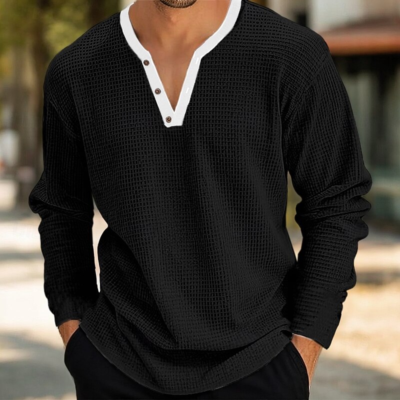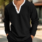 Highlights [Fabric] : Crafted from high-quality polyester with a waffle texture, this menβs Henley shirt offers enhanced breathability with a micro-elastic fit, ensuring great comfort and style. The fabric not only feels soft against the skin but also maintains its shape throughout the day. [Fit] : Designed with a regular fit, this long-sleeve shirt gives a sophisticated yet relaxed look, perfectly balancing casual comfort with a touch of elegance. It's an ideal choice for those seeking a versatile wardrobe essential. [Design Highlights] : This shirt features a distinctive V-neck and Henley button placket in a contrasting black color, adding a current flair to its design. The patchwork details accentuate its contemporary style, making it a standout piece for any wardrobe. [Occasions] : Perfect for daily wear, casual outings, and outdoor activities, this versatile shirt transitions seamlessly from a day at the office to a weekend adventure. Pair it with jeans or chinos for a laid-back yet polished appearance. [Size Range] : Available in a wide range of sizes from S to XXXL, this shirt caters to various body types, ensuring an appropriate fit for all preferences. Perfect for everyday use. supreme materials and excellent craftsmanship ensure long-lasting durability.