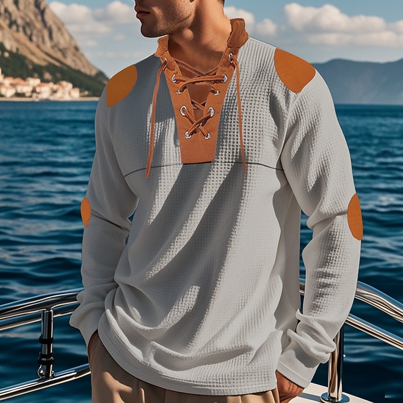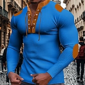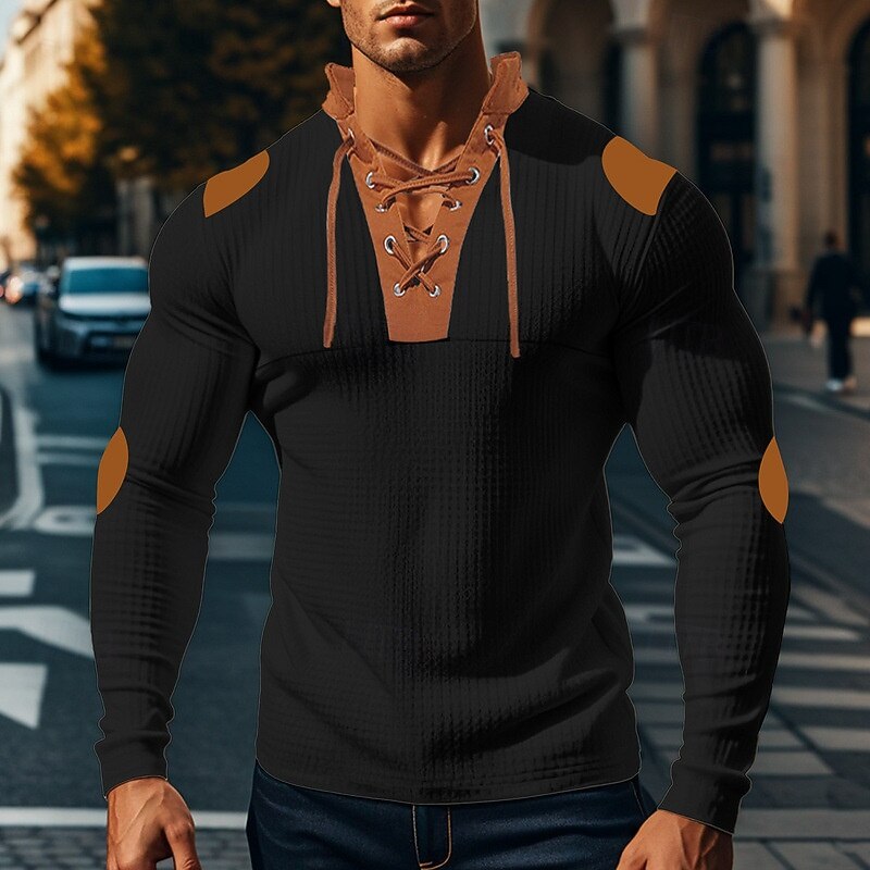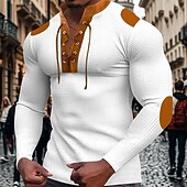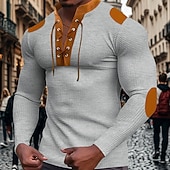 Men's T Shirt Henley Shirt Tee Waffle Knit Tee Long Sleeve Banded Collar Spring & Fall Brown Fashion Designer Basic Lace up Patchwork Vacation Street Going out Apricot Black White Top Tee for Men