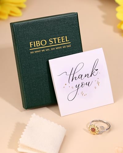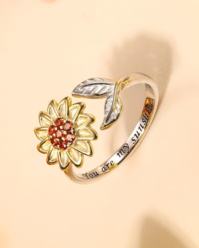 Ring size: AdjustableMaterial: Sterling SilverMetal type: Sterling SilverGem type: Cubic ZirconiaSunflower Ring:Sunflowers symbolize warmth,loyalty and faith,represents courage to pursue the happiness.Sunflower ring engraved you are my sunshine in the inner ring,paved with sparkling gold cubic zirconia to make the sunflower ring full of vitality.Perfect sunflower ring for your lover,bring happiness and beauty in her life925 Sterling Silver Rings:Sunflower rings for women are made of hypoallergenic solid sterling silver w/925 stamp and 14k gold plated,'925 means 92.5% silver, mixed with 7.5% alloy to increase strength and durability',lead&nickel free,passed strictly skin test,not turn your fingers green.Faceted clear shiny AAAA+ CZ inlaid,a touch more elegance and gorgeous to the ringAdjustable Fidget Ring:Size of sunflower spinner ring is adjustable,perfect to wear it alone or stack it with other stacking rings.Flower daisy ring is white gold plated,double layer thick plating craft to make sure tarnish resistant.Tips:the silver material is soft than other steel,please gently adjust to the right sizeAnxiety Rings for Women:The sunflower of the ring has a rotating design,can rotate smoothly,perfect for anyone looking to relax, de-stress, change bad habits, and focus at work, school, meetings, or meditation. The spinning ring is a great choice when you need to relax or change bad habitsPerfect Gift:Sunflower ring was well packaged with gift box,suitable as birthday gift,statement ring,engagement ring,wedding ring,thumb ring,promise ring for wife,lovers,friends,mother and all women,practical and meaningful,inspire people to feel nature,pursue healthy and hope,maintain a positive attitude to life and workWhy Choose Us:FIBO STEEL is a professional jewelry brand with a professional design team and an experienced factory. We only make finest attention to details Perfect for everyday use. High quality materials and excellent craftsmanship ensure long-lasting durability.