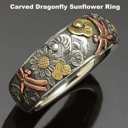 Ring size: 5Material: MetalMetal type: AlloyGem type: No Gemstone【Dragonfly Sunflower Ring】: The sunflower symbolizes warmth, positivity, and hope—just like the sun it follows.Paired with dragonfly pattern, this ring is not only a trendy accessory but also a meaningful symbol of strength, joy, and positivity.【Material】: These rings for women are made of alloy, which is light and strong, comfortable to wear, without sharps edges to skin irritation. Easy to put on and take off.【Suitable for Many Occasions】:Our jewelry rings are simple and stylish, they can be matched with dresses, clothes, necklaces, bracelets or other jewelry to enhance your elegant and temperament. Perfect gift for mother, wife, girlfriend, female friends on birthday, Valentine's Day, Mother's Day, special anniversaries and other holidays.【Best Gift】:Give This Sparkling Earring Like A Unique Present To Your Loved Ones, Like Lover Girlfriend, Wife, Fiancee, Etc, And all occasions Graduation gifts, Anniversary, Birthday, Christmas, Thanksgiving Day, Valentine's Day,Mother's Day.【Quality Service】: If There Are Any Problems With The Purchase, Please To Contact Us We Will Give You A Satisfactory Answer. Perfect for everyday use. supreme materials and excellent craftsmanship ensure long-lasting durability.