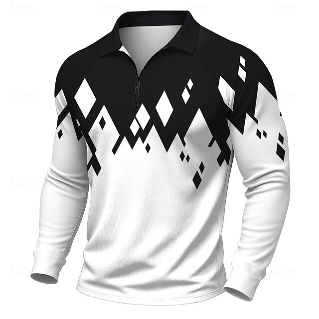 popular ! Men's Geometic Polo Long Sleeve Polo Shirts Casual Outdoor Street Daily Wear 3D Print Quarter Zip Polo Spring Fall Winter Black White