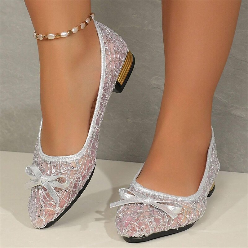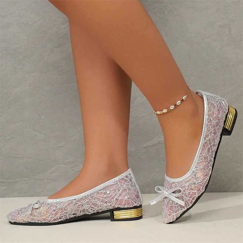 Highlights [Fabric and Material]: Crafted with a durable and stylish PU upper, these women's flats offer a comfortable and breathable experience. The elegant lace detailing on the mesh upper is beautifully complemented by a gold-tone embroidery for a luxurious finish. [Silhouette and Fit]: Featuring a sleek, pointed toe design, these flats have a sophisticated silhouette that flatters any foot shape. The low chunky heel adds just the right amount of lift while ensuring all-day comfort. [Design Highlights]: The standout feature of these flats is the charming satin bow adorning each toe, exuding feminine charm. A chic gold accent stripe on the low heel perfectly ties the whole design together, adding a subtle elegance to the overall look. [Occasions and Usage]: Perfect for casual outings, daily adventures, or even outdoor events, these flats transition effortlessly between various settings. Whether worn at a summer gathering or a relaxed weekend outing, they embody versatility and style. [Size Range]: Available in a range of sizes to accommodate different needs, from US6 / EU36 / UK4 / CN36 to US9.5-10 / EU41 / UK7.5-8 / CN42, these flats are designed to fit comfortably and elegantly for various foot sizes. Perfect for everyday use. supreme materials and excellent craftsmanship ensure long-lasting durability.