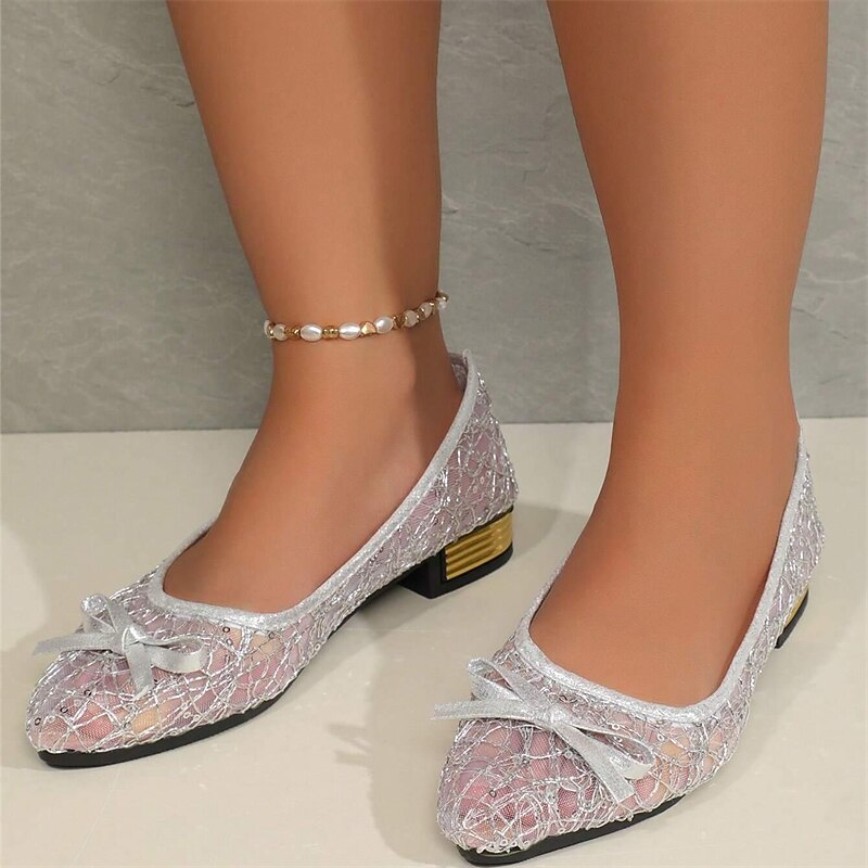 Women's Flats Plus Size Sparkly Sandals Comfort Shoes Outdoor Daily Solid Color Summer Bowknot Lace Chunky Heel Pointed Toe Elegant Casual PU Loafer Silver Gold