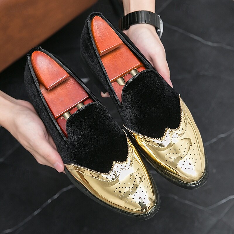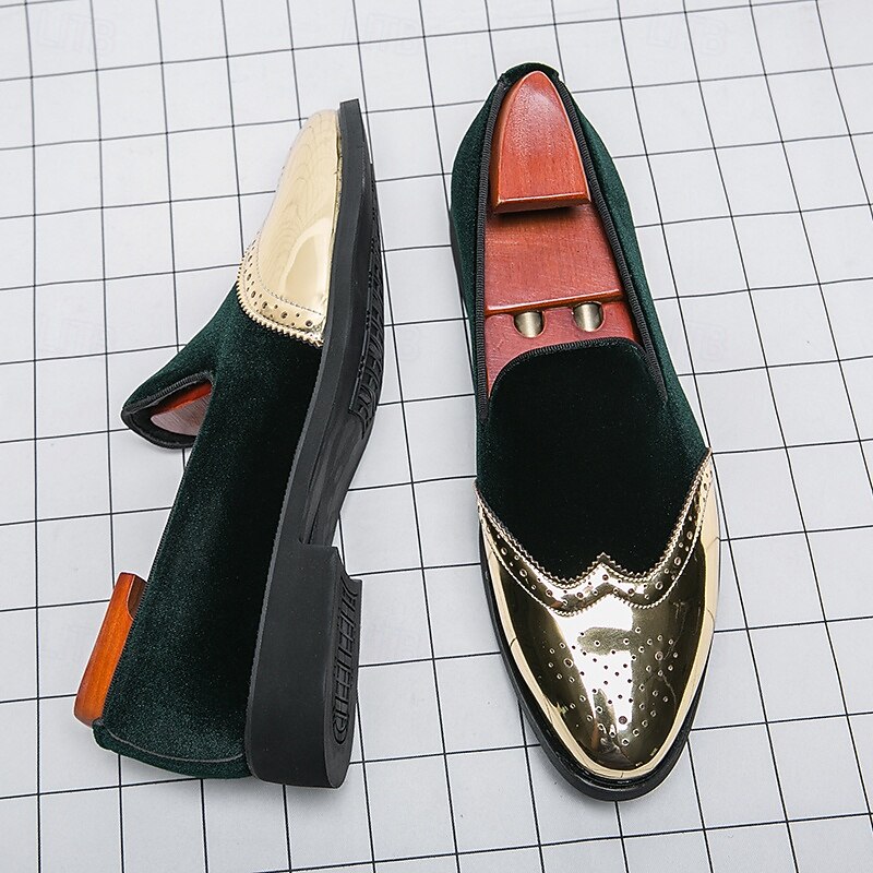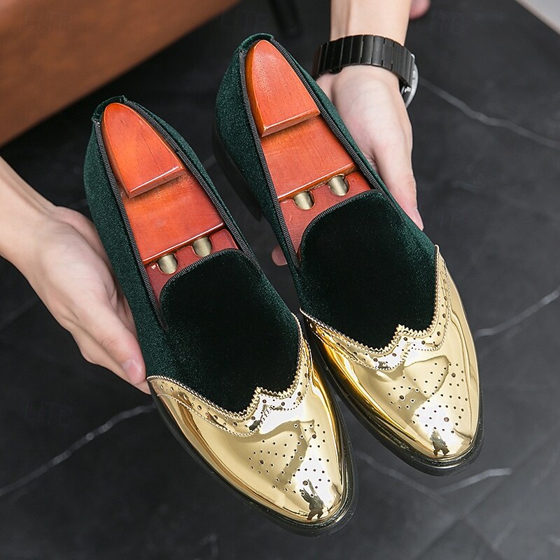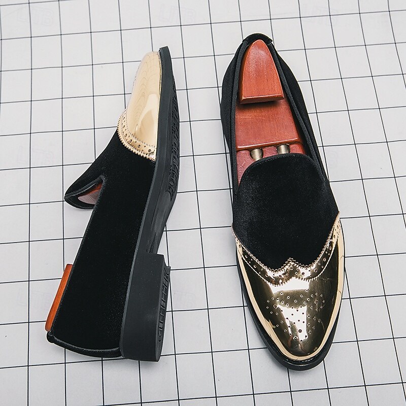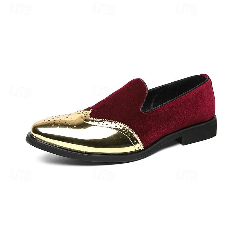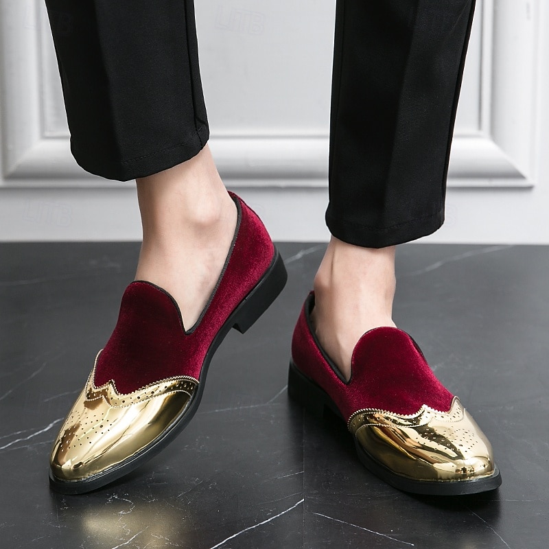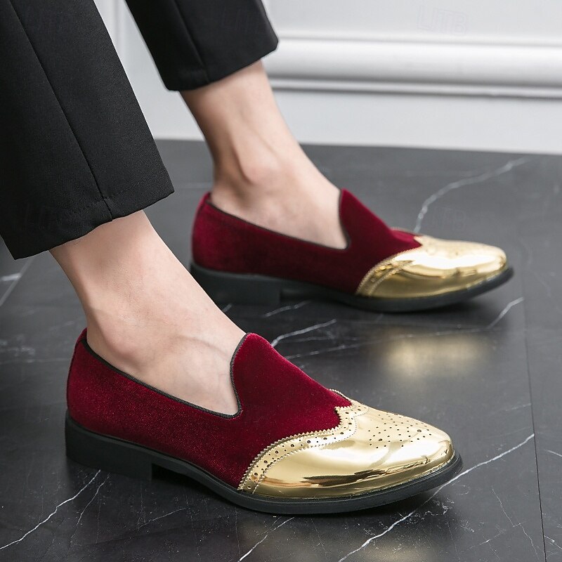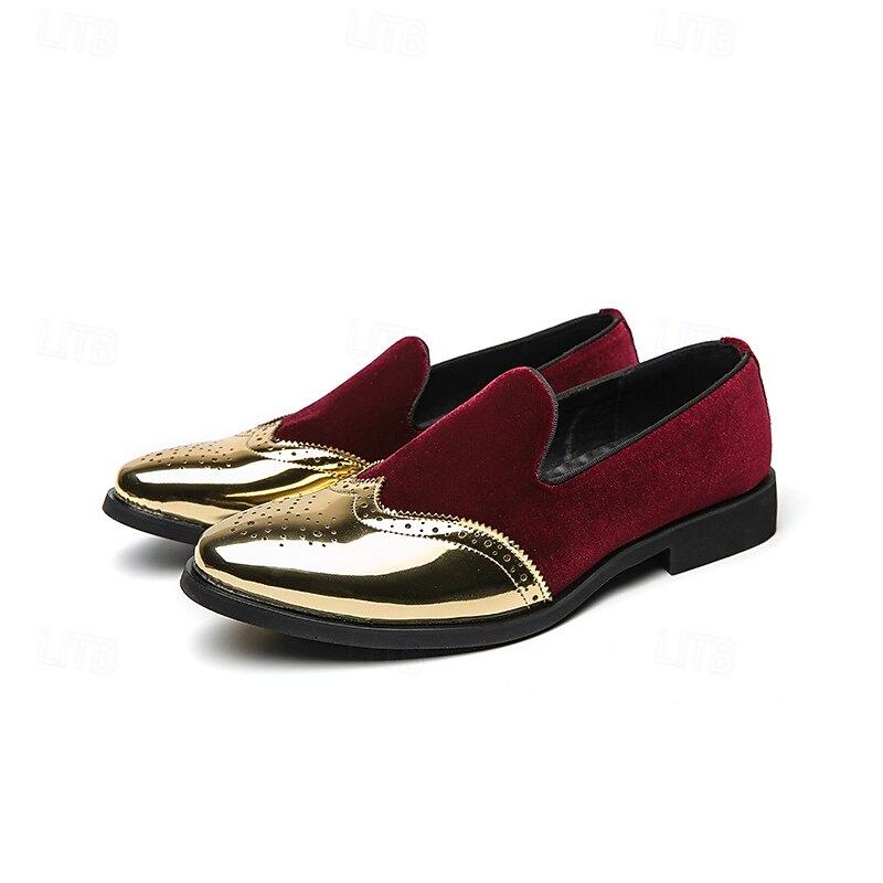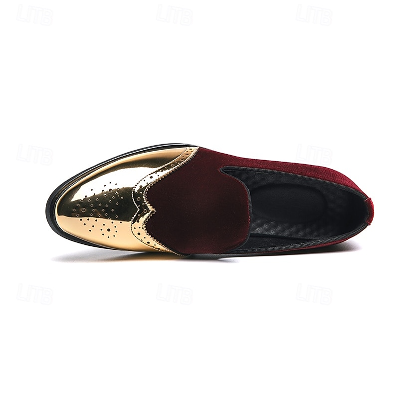 More information about Men's Prom Shoes - Burgundy Velvet and Gold Patent Leather Slip-Ons with Brogue Detailing for Formal Wear
