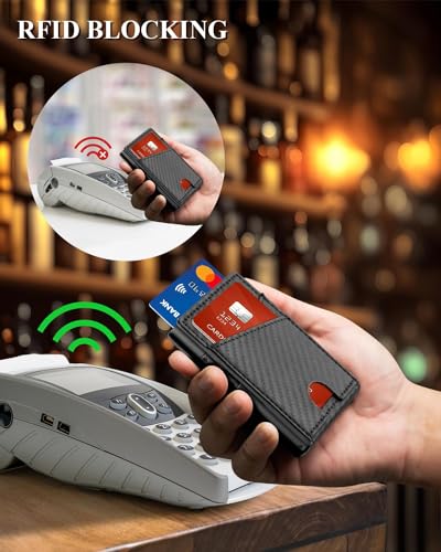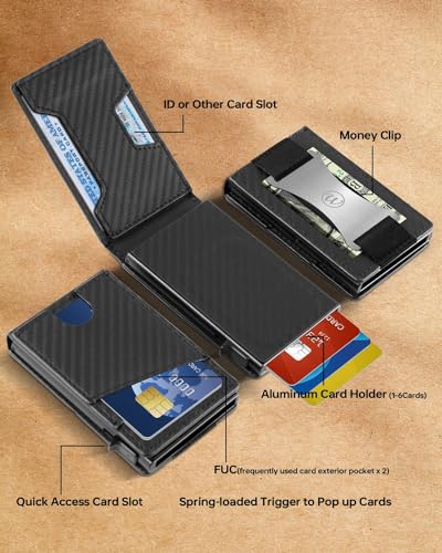 • 【One Touch Access】 This men's wallet pops out your cards with only one movement, enabling you to see all your cards at a glance and find your needed card instantly. The attached carbon leather front pocket of this wallet allows you to push out the remarkably-used card quickly. Fumbling through your old wallet should be a thing of the past.
