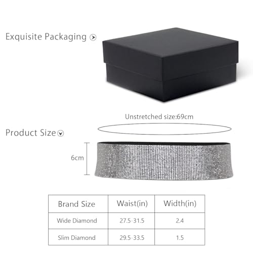 Fabric type: 100% LeatherCare instructions: Dry Cloth CleanOrigin: ImportedSTYLISH SIMPLE:The belt decorated with shiny rhinestones,radiating a dazzling light,let you become the focus of the crowd in a second.Soft PU material,slim fit design,highlight your sexy body curve.TWO STYLES:The belt is divided into slim style and widened style.The slim belt is suitable for creating an elegant and fashionable style.The wide belt is suitable for a personality stylish style.A variety of fashion collocations,choose whatever you want.ELASTIC BELT:The elastic waistband has some stretch to reduce the pressure on the waist and make it more comfortable to wear.Wide style waistband circumference 69cm (23.6in), recommended waist circumference 70-80cm (27.5-31.5in).Slim style waistband circumference 74cm (29.1in), recommended waist 75-85cm (29.5-33.5in).Only one size is available for each style, please refer to the size information before purchasing.SNAP DESIGN:The back use two metal snaps to secure it firmly.Compared with ordinary belt buckles,our belts can be easily fastened and taken off,which is very convenient to wear.ALL OCCASIONS: This latest trend elastic belt can match well with almost all type of casual outfits like dress,skirt,jeans,blouse,coat,suit,party wear etc.It is suitable for most of occasions like daily wear,weddings,parties,gatherings or fashion events. Perfect for everyday use. High quality materials and excellent craftsmanship ensure long-lasting durability.