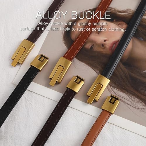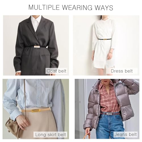 Fabric type: 100% LeatherCare instructions: Hand Wash OnlyOrigin: ImportedFASHION SKINNY BELT: Thin belt is exquisite and sleek, showing elegant femininity. Classic solid colors give a fresh and simple look. Available in various colours, playing with versatile outfits. The belt features an interlocking buckle closure, making it convenient to open and close, and hidden for a gorgeous appearance. The distressed metal fasteners embrace the vintage appeal. Gold is antique and gorgeous, silver is understated and shows off the advanced style.supreme MATERIAL: The belt is made of cowhide leather belt surface and microfibre leather belt lining, with a delicate and full texture. High-quality cowhide leather is flexible and sturdy, not easy to break. Good breathability brings comfortable and refreshing wearing experience. Oiled edges provide a neat trim and reduce wear. Zinc alloy buckle is lightweight and textured, not easy to rust or fade. Smooth finish prevents scratches on clothing.ADJUSTABLE WAIST: The belt length is 98 cm, one size fits most women's waist circumference. A movable buckle at the back of the waist allows for a sliding adjustment to a snug fit. Simultaneously stretch the strap body outwards to extend the size. Grab the back side of the belt with belt loops and pull it tight to both sides, the overlap becomes longer to reduce the size. The stretchable belt flexibly adjusts to different lengths, suitable for waist circumference 50-90 cm.VERSATILE ACCESSORY: Skinny belt accentuates the waistline, outlines the slim waist, flexibly matching with various attire. Pair it with a dress to optimize your body proportions and harmonise the overall outfit. Matching with shirt skirt or trousers, intellectual and capable, easy to take the temperament of office ladies. Pair with a T-shirt and jeans for a trendy retro look, exuding youthful vitality. Pair it with a coat, sharp and layered, and tighten the loose fit for a lightweight styling.APPLICABLE OCCASIONS: A belt enhances dressing taste and makes the look more elegant and attractive. The fashion accessory easily manages various occasions, whether it is a formal business meeting, a relaxed casual gathering, a stylish party banquet, or a romantic date night. Ideal gift for family or friends on birthdays, Valentine's Day, Mother's Day, Christmas, New Year's Day and more important events. Perfect for everyday use. High quality materials and excellent craftsmanship ensure long-lasting durability.