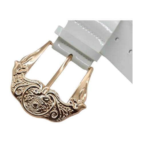 Women White Fashion Belt - Faux Leather Waistband Gold Metal Filigree Western Buckle S M z226