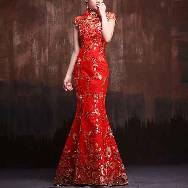 More information about Mermaid Evening Gown Vintage Dress Wedding Guest Formal Evening Floor Length Short Sleeve High Neck Satin with Sequin Embroidery dress to impress