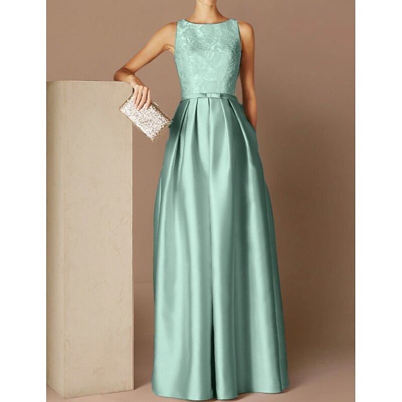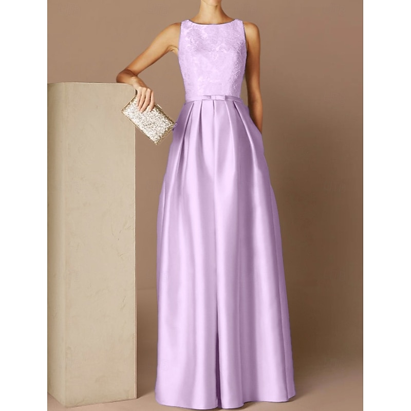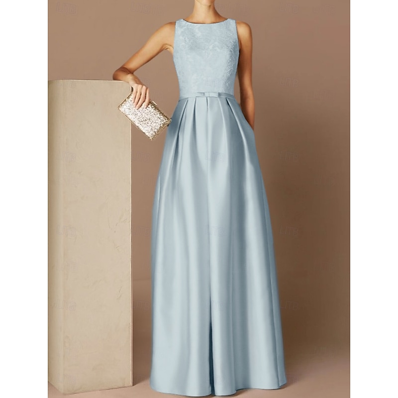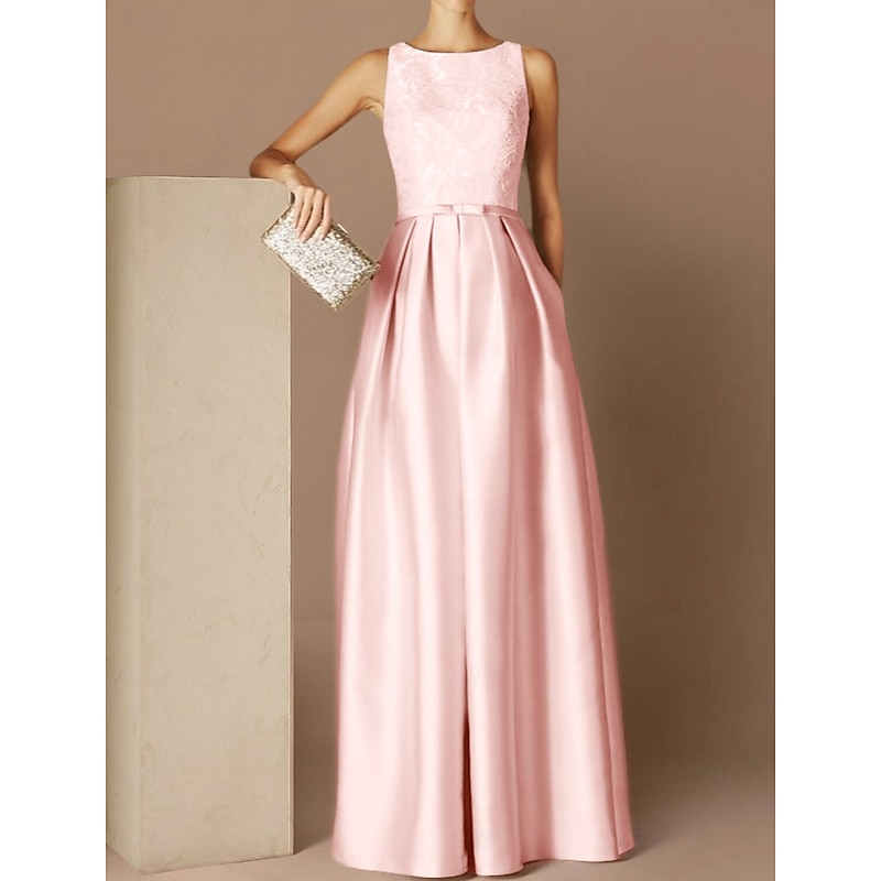 popular ! Beach Wedding A-Line Evening Gown Elegant Dress Formal Evening Floor Length Sleeveless Jewel Neck Fall Wedding Guest Satin with Sash / Ribbon Pleats Appliques