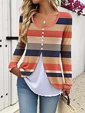popular ! Women's T Shirt Graphic Plaid Striped Elegant Vintage contemporary Long Sleeve Crew Neck Round Neck Regular Tops Daily Buttons Print Tiered Orange Spring Fall Winter