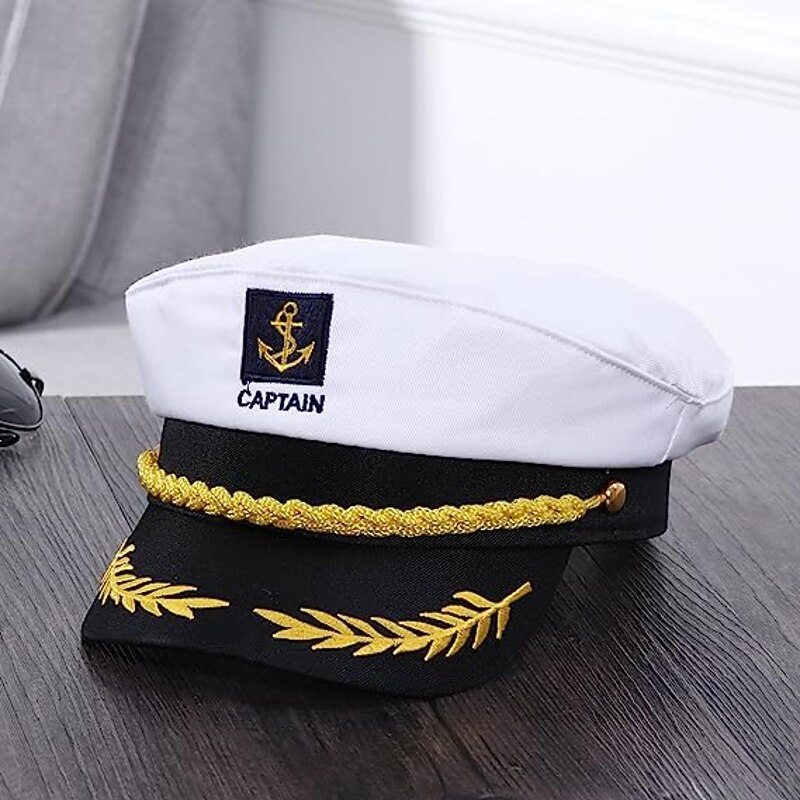 : The hat features a striking combination of a white crown and contrasting black brim. An embroidered gold anchor emblem adorns the front, accompanied by the word "CAPTAIN" for an authentic nautical theme. A gold braided rope and golden leaf embroidery on the brim add a touch of elegance and sophistication.