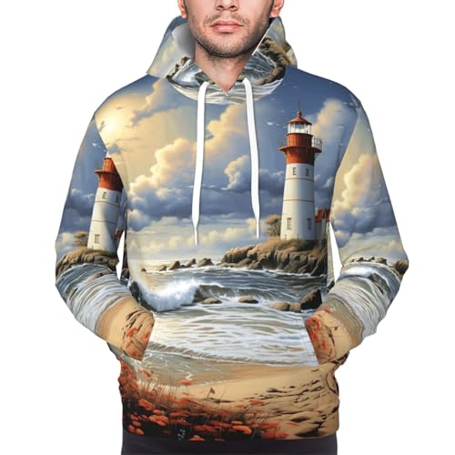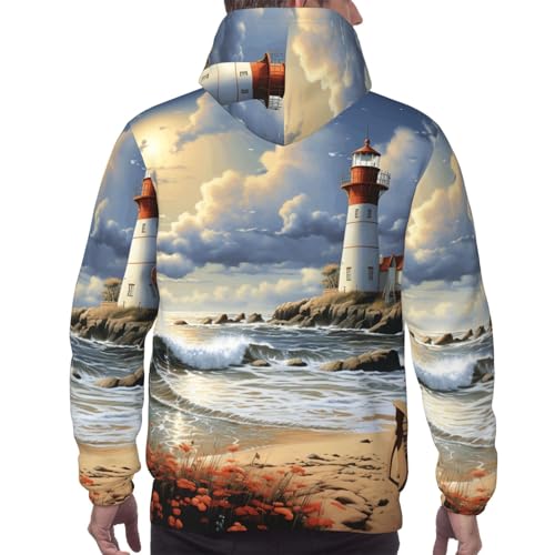 Men's Fleece Pullover Hoodie Long Sleeve Hooded Sea Lighthouse Sandbeach Sweatshirt Casual Shirts With Pockets