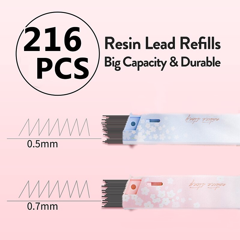 Highlights 【Exquisite Set】- Get a perfect mechanical pencil set with 3pcs 0.5mm and 3pcs 0.7mm mechanical pencils. Also includes 3 tubes of 0.5mm lead refills, 3 tubes of 0.7mm pencil lead, and 3pcs erasers. 【Triangular Grip】- The mechanical pencil features a triangular grip design that ensures a snug hold and prevents slipping. The smooth barrel and lightweight design provide a relaxing and efficient writing experience. 【216pcs Upgraded Resin Lead】- Made of high-quality resin and graphite, the pencil lead is strong, tough, and smooth. With 6 tubes of lead refill, you will have a total of 216pcs to last you a long time. 【Two types of Nibs】- Switch between the 0.5mm and 0.7mm nibs as needed. These cute mechanical pencils are suitable for writing, painting, drafting, drawing, sketching, and more. 【Lovely Color】- This pink mechanical pencil set is specially designed for girls and makes an ideal gift choice for friends, classmates, and family.