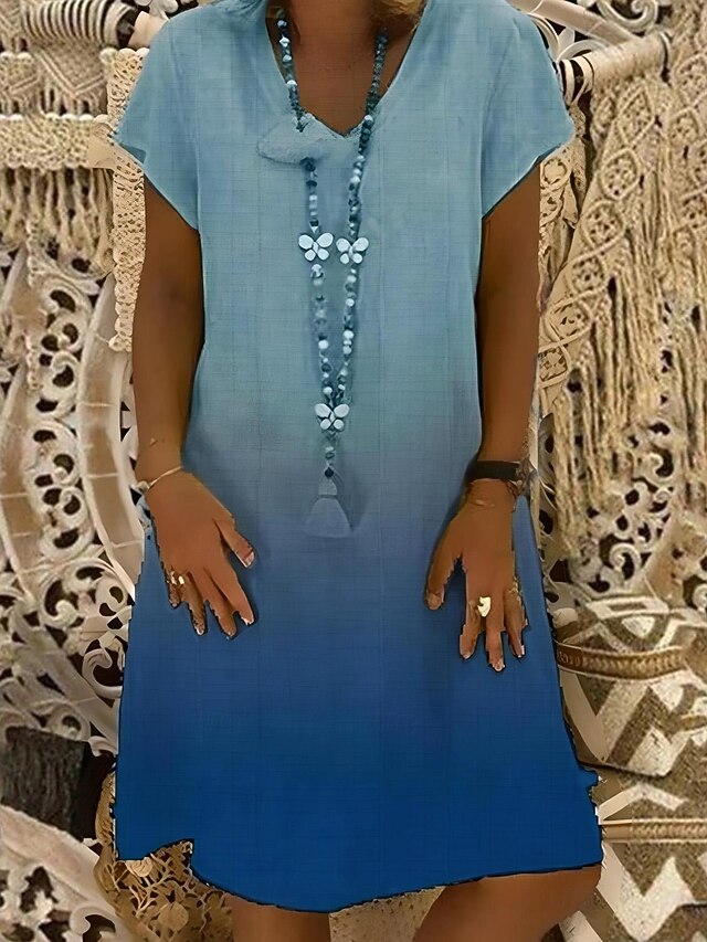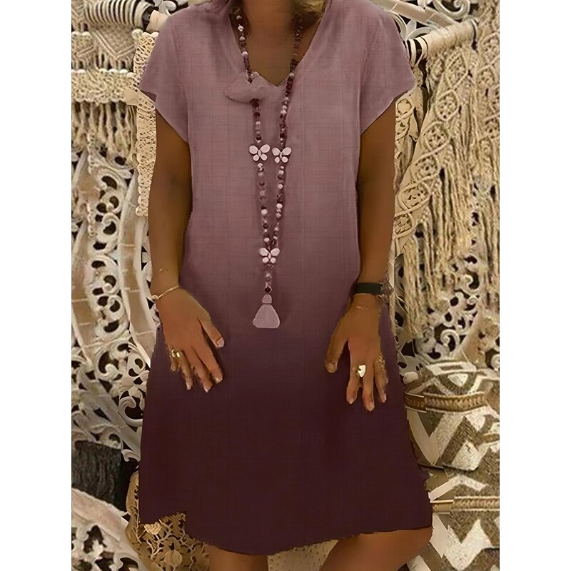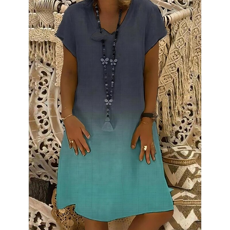 Highlights [Fabric] : Crafted from a breathable linen blend, this dress offers a lightweight and airy feel that keeps you cushy and cool in the summer heat. The fabric’s micro-elasticity ensures a relaxed fit and easy movement. [Style] : Featuring a regular fit, the dress boasts a straight cut that drapes elegantly on the body, making it suitable for various body types. The midi length adds a touch of sophistication without compromising on comfort. [Design Highlights] : The dress showcases a stunning ombre print transitioning from light to deep hues, adding visual interest and charm. Its V-neckline and short sleeves provide a enduring silhouette, while the loose fit ensures a breezy, casual look. [Occasions] : Ideal for vacations and daily wear, this versatile dress effortlessly transitions from a casual day out to a beach getaway. Pair it with accessories like a beaded necklace for a bohemian flair suitable for any relaxed, sunny setting. [Size Range] : Available in a variety of colors including Green, Black, Red, Sky Blue, Navy Blue, and Yellow, and sizes ranging from S to 3XL, ensuring a comfortable fit for all preferences.