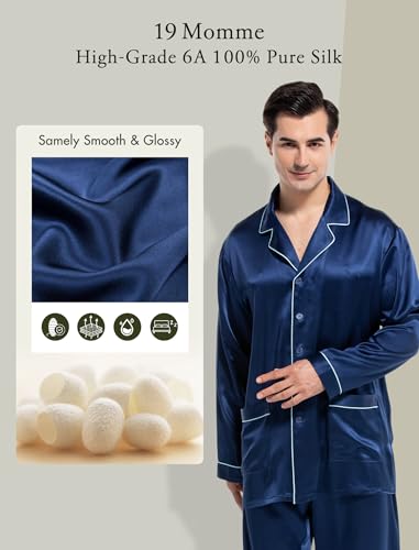 Fabric type: Mulberry SilkCare instructions: Hand Wash OnlyOrigin: Imported19MM Mulberry Silk Pajamas for Men:Crafted with GRADE 6A 100% mulberry pure silk,these luxurious mens silk pajama set offer a silky-smooth touch and breathable comfort,the hypoallergenic fabric ensures temperature regulation, perfect for to keeping your skin moistureLuxury Mens Silk Pajama Set:Designed with notch collar,banded cuffs,unility pocket and elastic waistband with drawsting,these mens silk pajamas blend classic sophistication with modern functionality while charmeuse silk(available for couples) make them a trendy choice for matching pajamas for couplesVersatile Men Silk Pajamas Set:Perfect for loungewear at home,post-surgery recovery,or even as luxury sleepwear for travel,these silk PJs adapt to any lifestyle.The silk can regulate your body's temperature and let your skin breathe freely all the night,whether you’re relaxing with a book or hosting a cozy nightMen Valentine's Gifts Choice:A standout Valentine's gift for men,these silk pajamas set come in premium gift-ready packaging.Pair them with a exquisite storage bag for couples to create a romantic surprise your husband,father or brother on birthdays,Christmas or anniversariesDry Clean Recommende for Silk Product:Dry cleaning is advised to preserve the lustrous finish of the charmeuse silk. While hand washing is possible,it may cause mild dullness on the satin surface.Ironing the garment post-handwashing can partially revive the sheen of the silk side Perfect for everyday use. supreme materials and excellent craftsmanship ensure long-lasting durability.