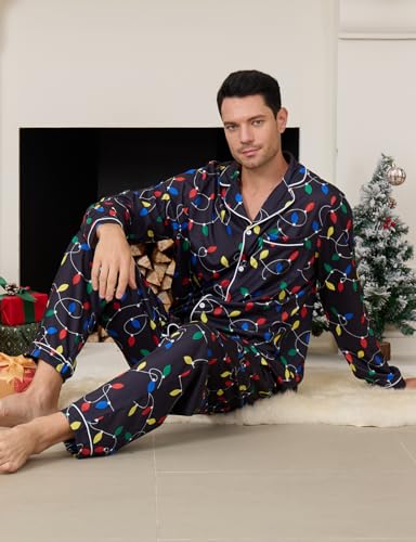 Fabric type: 95% Polyester, 5% SpandexCare instructions: Machine WashOrigin: ImportedFur description: 95% Polyester, 5% SpandexSoft Material: Christmas pajama Sets are made of 95% Polyester + 5% Spandex, stretch fabrics, superior stitching, smooth and breathable, skin-friendly, and keep you warm all winter. Whether you’re sleeping or lounging, these pajamas treat you to snuggle-worthy comfort all throughButton-Front Design: Xmas pajamas for couples feature a button-down top, notched collar, and contrast piping. Full-length pants with two side pockets can easily fit your phone and wallet. Elasticized drawstring waistband adjusts to fit, providing convenience when nature callsFestive Inspired Pattern Design: Xmas Pajamas Set featuring festive patterns and bright colors, including Xmas lights, Santa Claus, Snowmen, Snowflakes, Gingerbread, Plaid, etc. You’ll love the colorful Christmas print that lends a festive flair to any settingOccasion: Suitable for pajama parties and daily pajamas, autumn, winter, and daily life. It will be a super surprise for your lover, husband, boyfriend, brother, and son as a gorgeous present for New Year, Father's Day, Valentine's Day, and ChristmasTips: Machine washable/hand washable, can be used dryer. This sleepwear for Couples is carefully made to ensure maximum durability, so don't worry about color fading after washing. Please read the size guide carefully. If you prefer a looser fit, we recommend choosing a size up Perfect for everyday use. supreme materials and excellent craftsmanship ensure long-lasting durability.