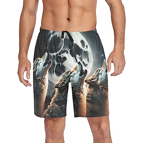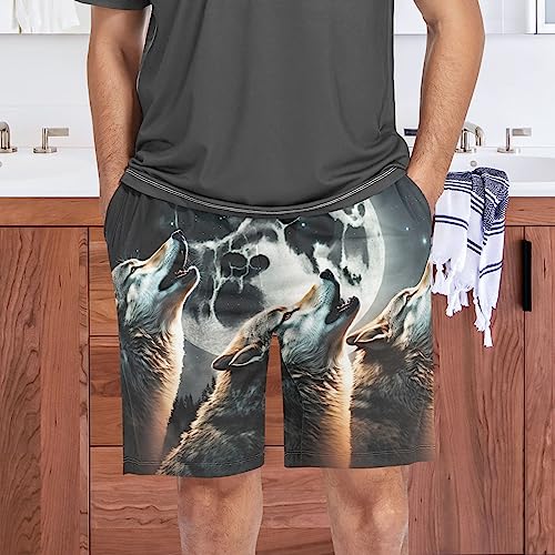 Men's Sleep Short – Wolf and Moon, Pajama Pants with Side Pockets Elastic Waistband Drawstring