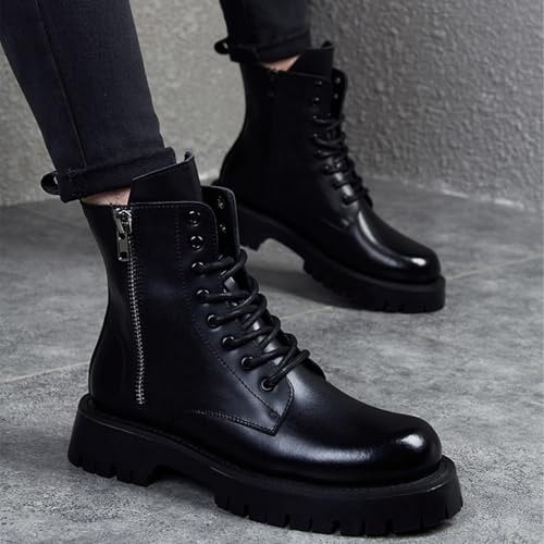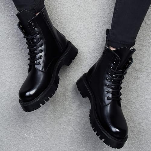 Men's Black Leather Platform Combat Boots with Side Zipper iconic Lace Up Non-slip Lug Sole Chunky Heel Motorcycle Booties Punk Biker Chukka Boots