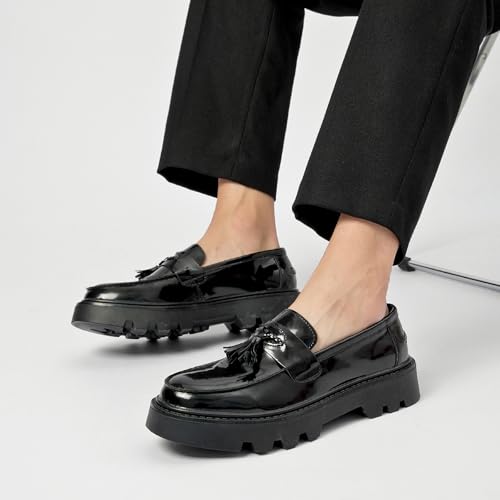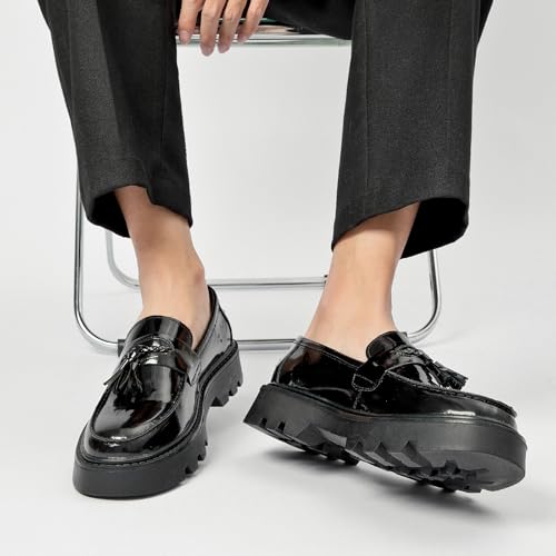 More information about Men's Black Patent Leather Platform Loafers Slip-On Dress Shoes with Tassel, Non-Slip Lug Sole Round Toe Penny Formal Shoes for Business Work & Daily