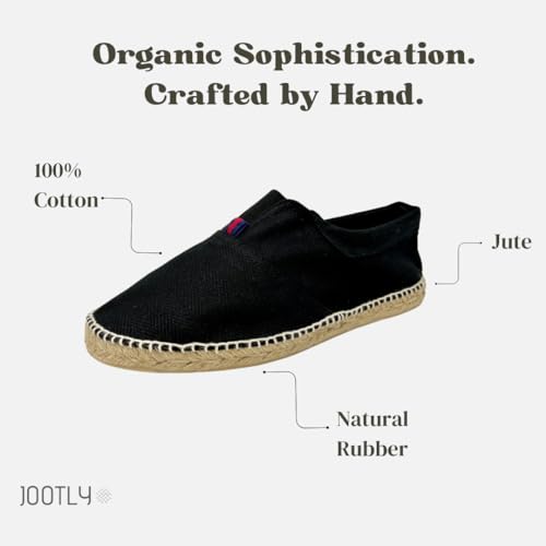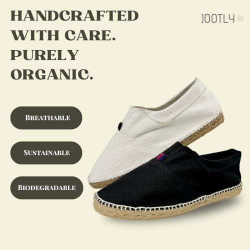 Sole material: JuteOuter material: CanvasClosure type: Pull-OnWater resistance level: Water RepellentNatural Materials: These espadrilles are made using eco-friendly and sustainable materials including organic cotton canvas uppers.Breathable: The natural materials allow your feet to breathe, reducing the chances of discomfort or odors.Handcrafted: Each pair of espadrilles is meticulously hand-sewn by skilled artisans, making them an excellent investment for seasons to come.Style: Whether you're relaxing at the beach, running errands, visiting the office, or simply lounging at home, Jootly has your preferred style covered for every moment!Eco-Conscious: By choosing hand-sewn espadrilles, you're supporting sustainable and ethical fashion practices. flawless for everyday use. supreme materials and excellent craftsmanship ensure long-lasting durability.